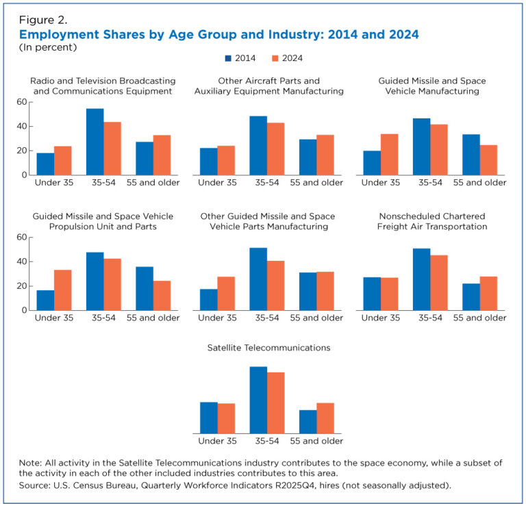 The net result across the space economy is a shift toward a younger workforce over the past decade — the share of workers under 35 increased 32% while the share over 55 increased by less than 1%.